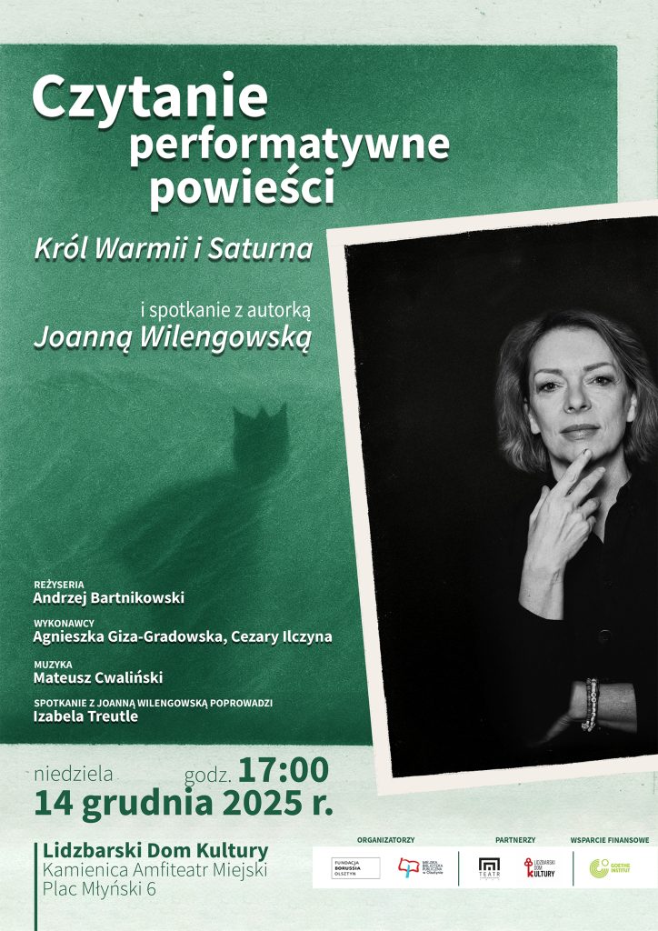 Zapraszamy 14 grudnia do Kamienicy Amfiteatr Miejski (Plac Młyński 6 Lidzbark Warmiński) o godzinie 17:00 na czytanie perfomatywne powieści „Król Warmii i Saturna” w wykonaniu aktorów Teatru im. S. Jaracza w Olsztynie. Wydarzeniu towarzyszy spotkanie z autorką książki – Joanną Wilengowską. Rozmowę poprowadzi Izabela Treutle