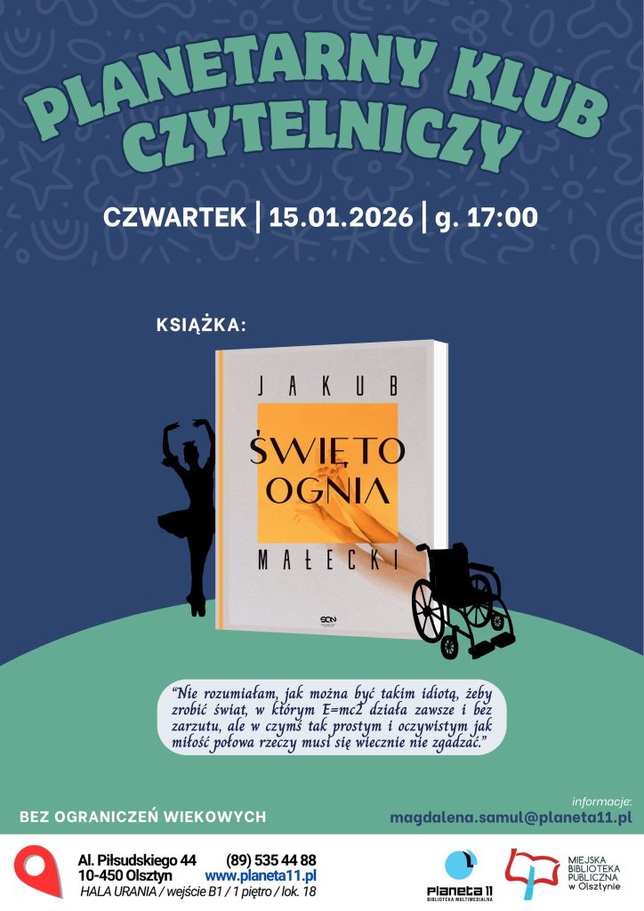 Już w najbliższy czwartek, 15 stycznia o godz. 17:00 spotykamy się na pierwszym spotkaniu Planetarnego Klubu Czytelniczego w nowym roku! Tym razem porozmawiamy o powieści ” Święto ognia” Jakuba Małeckiego.