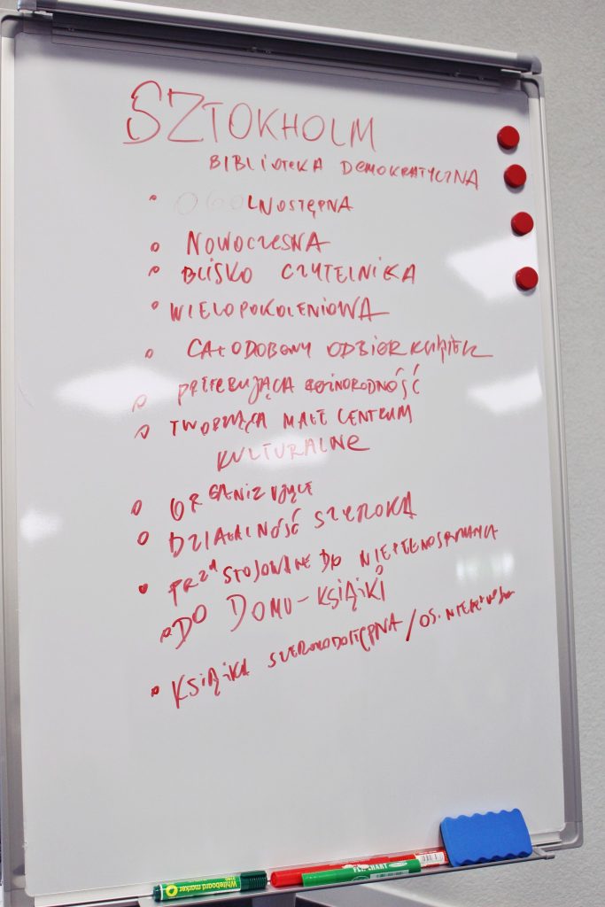 Szwedzki system bibliotek działa precyzyjnie i dokładnie jak szwajcarski zegarek. Mogliśmy się przekonać o tym na każdym kroku. Program był bardzo napięty, a Kaisa, nasza koordynatorka ze Sztokholmu, postarała się, byśmy mogli zapoznać się z funkcjonowaniem wielu bibliotek, o różnych kompetencjach i zadaniach.