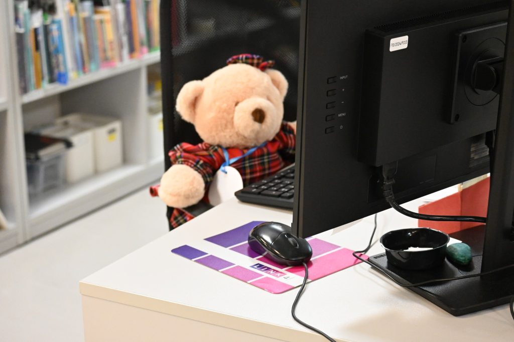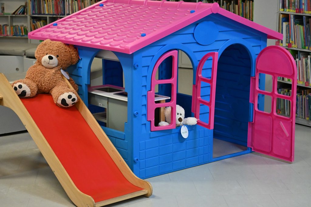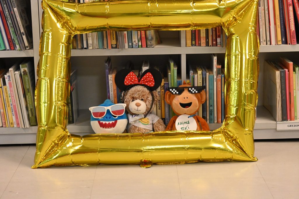 Małpka Kiki, Kuromi i Kiluś postanowili zrobić sobie pamiątkowe zdjęcie. W tym czasie Misiek i Miś Zdzisiek bawili się na zjeżdżalni, a inna Misia z ciekawością przeglądała katalog biblioteki, planując, co warto wypożyczyć następnym razem.