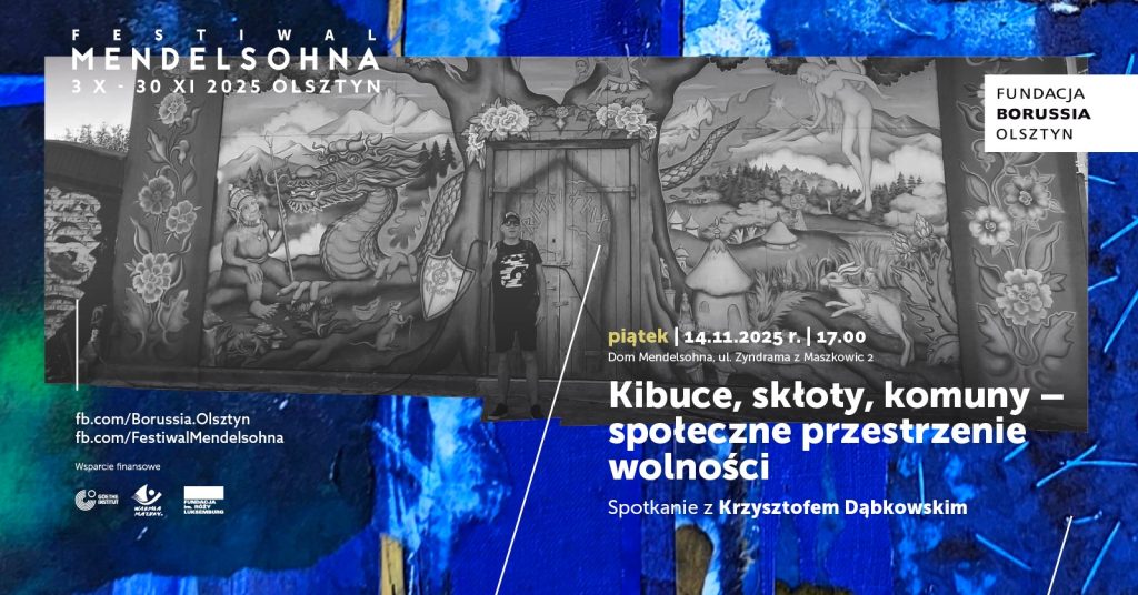 W piątek, 14 listopada o godzinie 17.00 zapraszamy na spotkanie z Krzysztofem Dąbkowskim „Kibuce, skłoty, komuny – społeczne przestrzenie wolności”. Wydarzenie odbędzie się w ramach X Festiwalu Mendelsohna w siedzibie Fundacji Borussia przy ulicy Zyndrama z Maszkowic 2.